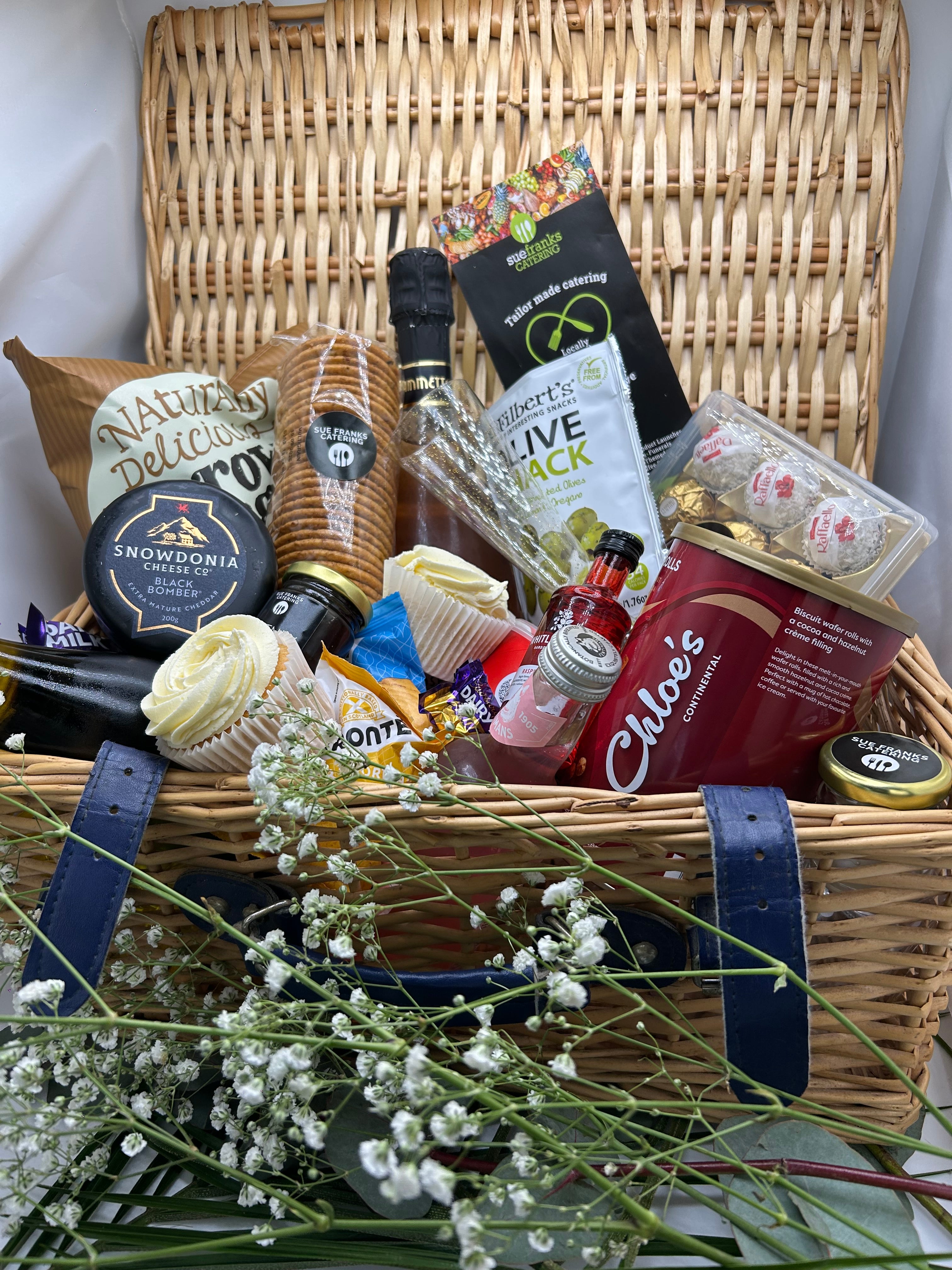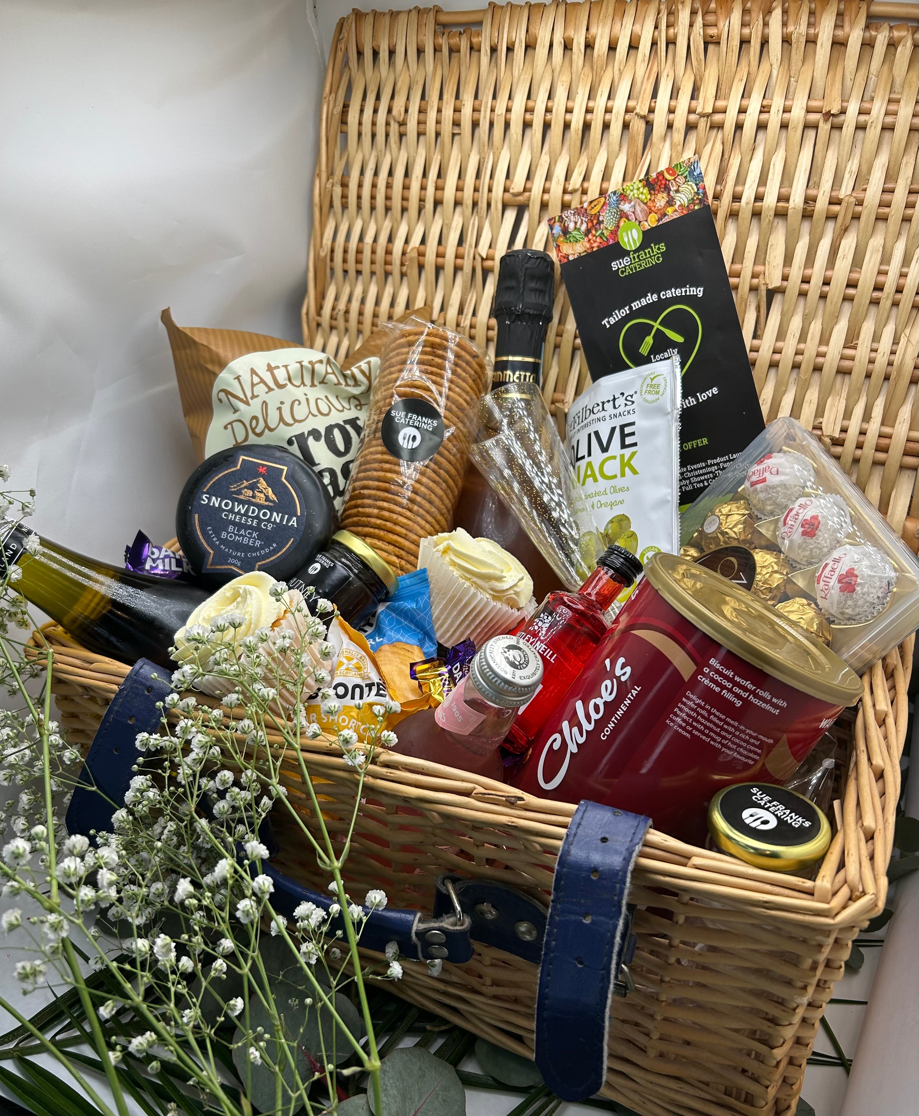 Cheese truckle and biscuits Large bottle of wine 3 mini bottles of wine and sparkling Potato crisps Selection of sweet biscuits and chocolates